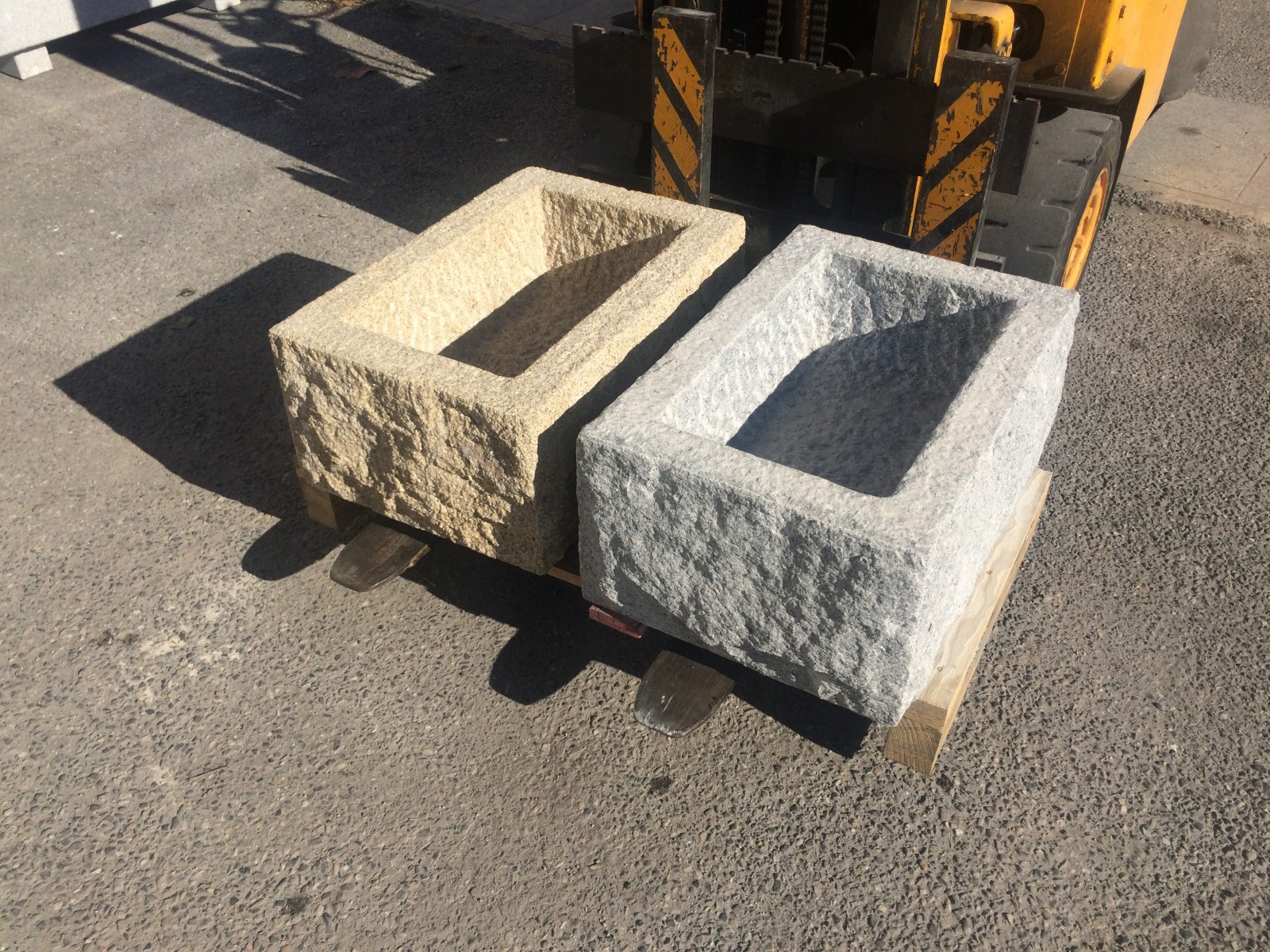 Bassin en pierre granit  gris ou beige , dimensions environ 60 cm de large  x  40 cm profondeur et hauteur 25 cm.